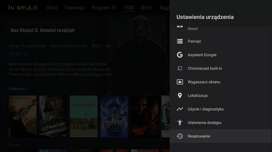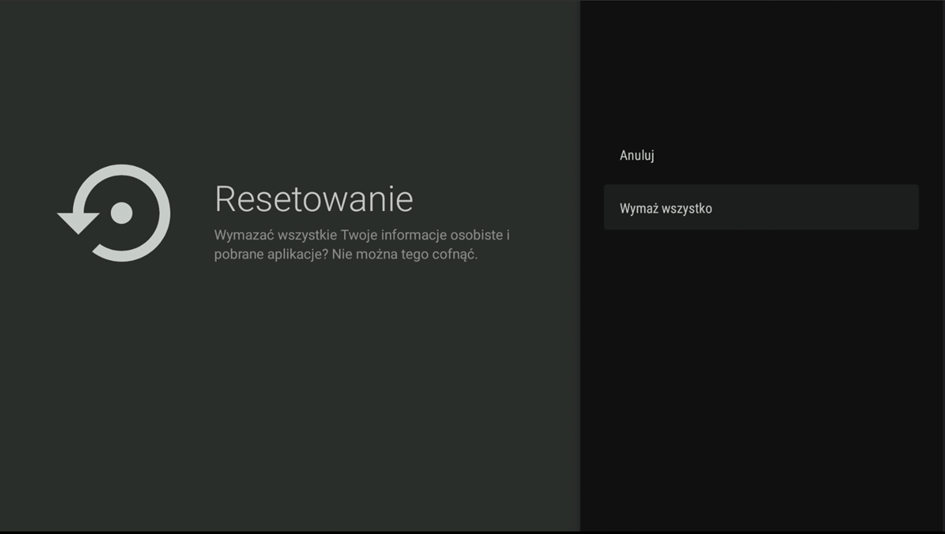 Przywrócenie ustawień fabrycznych spowoduje utratę wszelkich danych dotyczących kont i zainstalowanych aplikacji. Proces ten będzie wymagał ponownej instalacji i konfiguracji aplikacji oraz ponownego dodania kont na dekoderze, analogicznie do sytuacji podczas pierwszej instalacji.