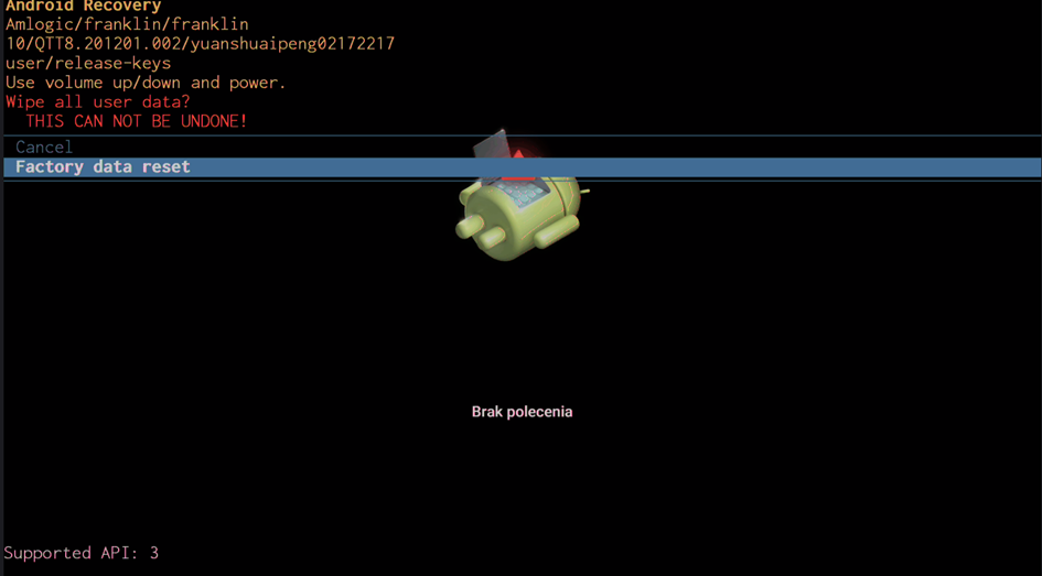 4. Pilotem wybieramy opcję „Wipe data/factory reset”