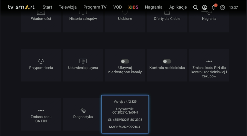 3. W zakładce „Profil Klienta” poszukaj „kafelka” z numerem użytkownika i adresem MAC dekodera.